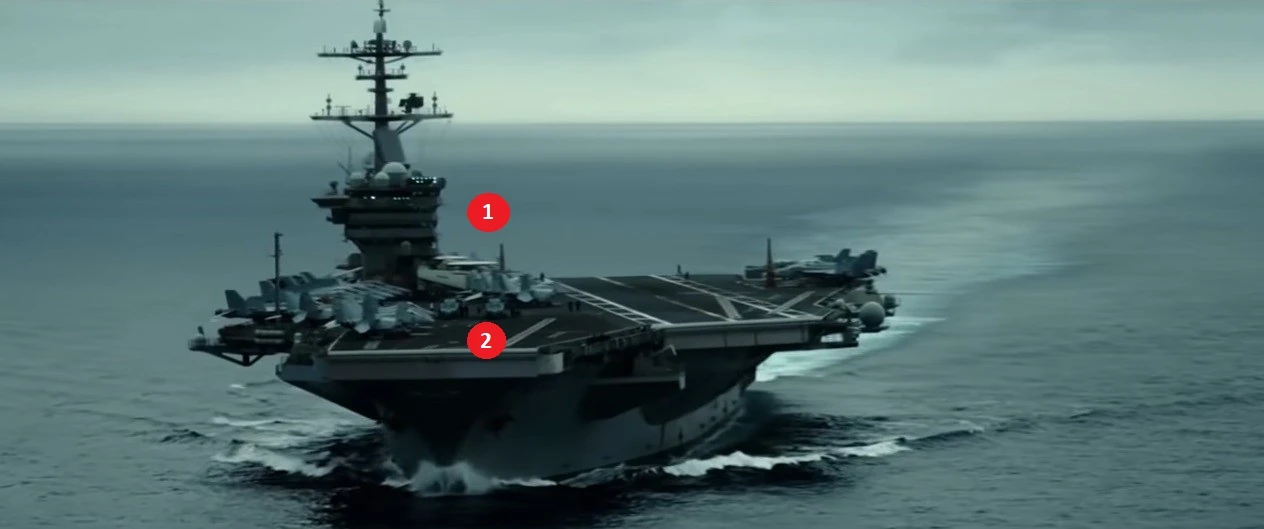 On an unidentified Nimitz-class aircraft carrier, most of shapes are F-18s surrounding two Sikorsky SH-60 Seahawks (2) and two wing folded Northrop Grumman E-2 Hawkeyes (1).